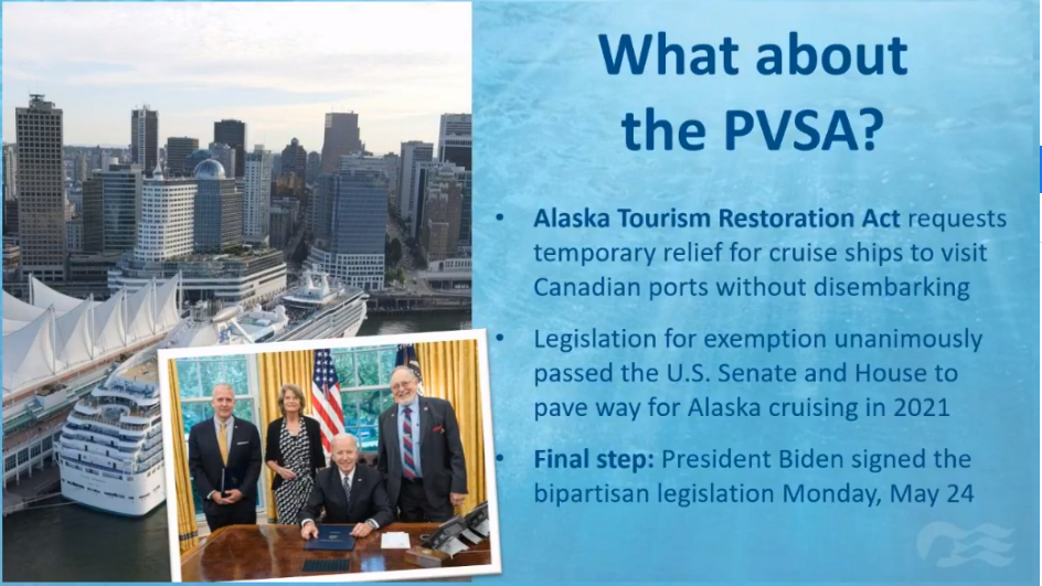Late last week, after ASTA Legislature Day on Capitol Hill in Washington D.C., both the Senate and House of Representatives passed legislation that would allow cruise ships to avoid stopping in a foreign port (somewhere in Canada) during the Alaskan cruise.   President Biden signed it into law on Monday.